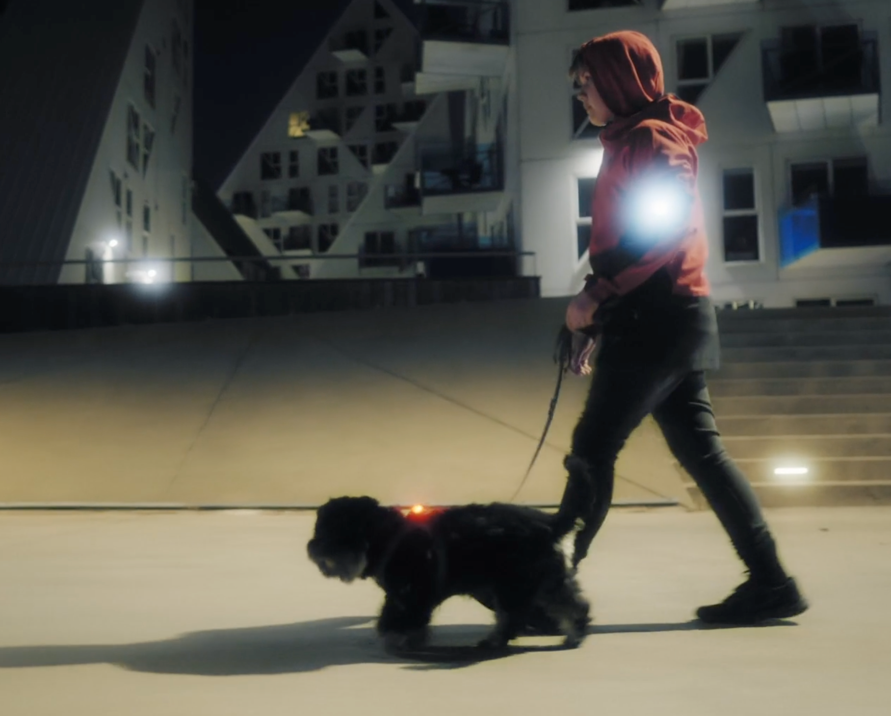 It makes your dog clearly visible in the dark, so drivers of cars, scooters and cyclists can adjust their speed early on and approach carefully.